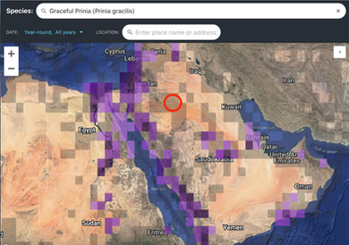 Slim chance of seeing the swallow again, but I was interested, however, in finding out what, if any, prinias occurred at the spot. There were no reports in eBird of either Graceful Prinia (P. gracilis) or Delicate Prinia (P. lepida) for the area, and Nader reported never encountering prinias anywhere around Sakaka before. I found this odd given the abundance of farms and small wetlands, but considering Sakaka is over 250 kilometers north, across the vast sand desert of the Great Nafud, from the nearest Graceful Prinias in Ha'il, over 400 kilometers east of the nearest in Tabuk, and over 450 kilometers southwest of the nearest Delicate Prinias in Iraq, perhaps it's no big surprise—much too great a distance to cover, from virtually every direction, for such small, weak flyers as prinias.